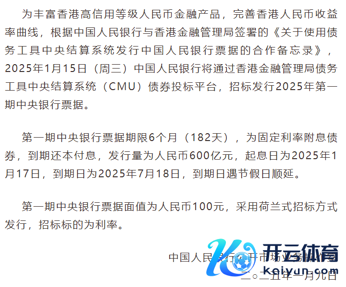 中国东谈主民银行(下称“央行”)1月9日发布音书称,为丰富香港高信用等第东谈主民币金融家具,完善香港东谈主民币收益率弧线,把柄央行与香港金融管制局签署的《对于使用债务用具中央结算系统刊行中国东谈主民银行单子的联接备忘录》,2025年1月15日(周三)央即将通过香港金融管制局债务用具中央结算系统(CMU)债券投标平台,招标刊行2025年第一期中央银行单子。