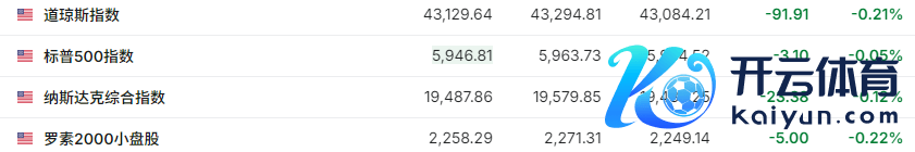 好意思股三大指数皆跌。标普500指数收跌12.57点,跌幅0.21%,报5937.34点。谈琼斯工业平均指数收跌68.42点,跌幅0.16%,报43153.13点。纳斯达克概括指数(纳指)收跌172.94点,跌幅0.89%,报19338.29点。纳斯达克100指数收跌146.60点,跌幅0.69%,报21091.25点。纳斯达克生物科技指数收跌0.45%,报4313.13点。臆想纳指100科技业成份股进展的纳斯达克科技市值加权指数(NDXTMC)收跌0.96%。对经济周期更敏锐的罗素2000小盘股指数收涨0.15%。