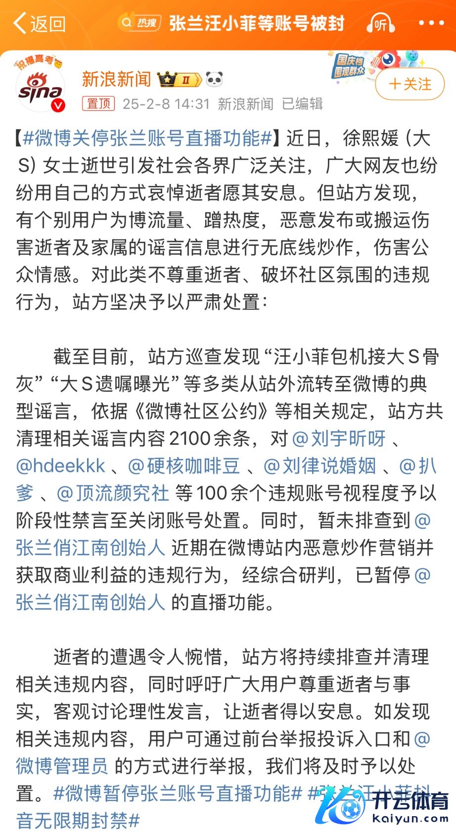 2月8日,微博经管员发布公告,近日,徐熙媛(大S)女士死灭激励社会各界平淡缓和,但站方发现,有个别用户为博流量、蹭热度,坏心发布或搬运伤害死人及家属的坏话信息进行无底线炒作,伤害公众心扉。对此类不尊重死人、破裂社区氛围的违纪动作,站方坚贞给以严肃经管。