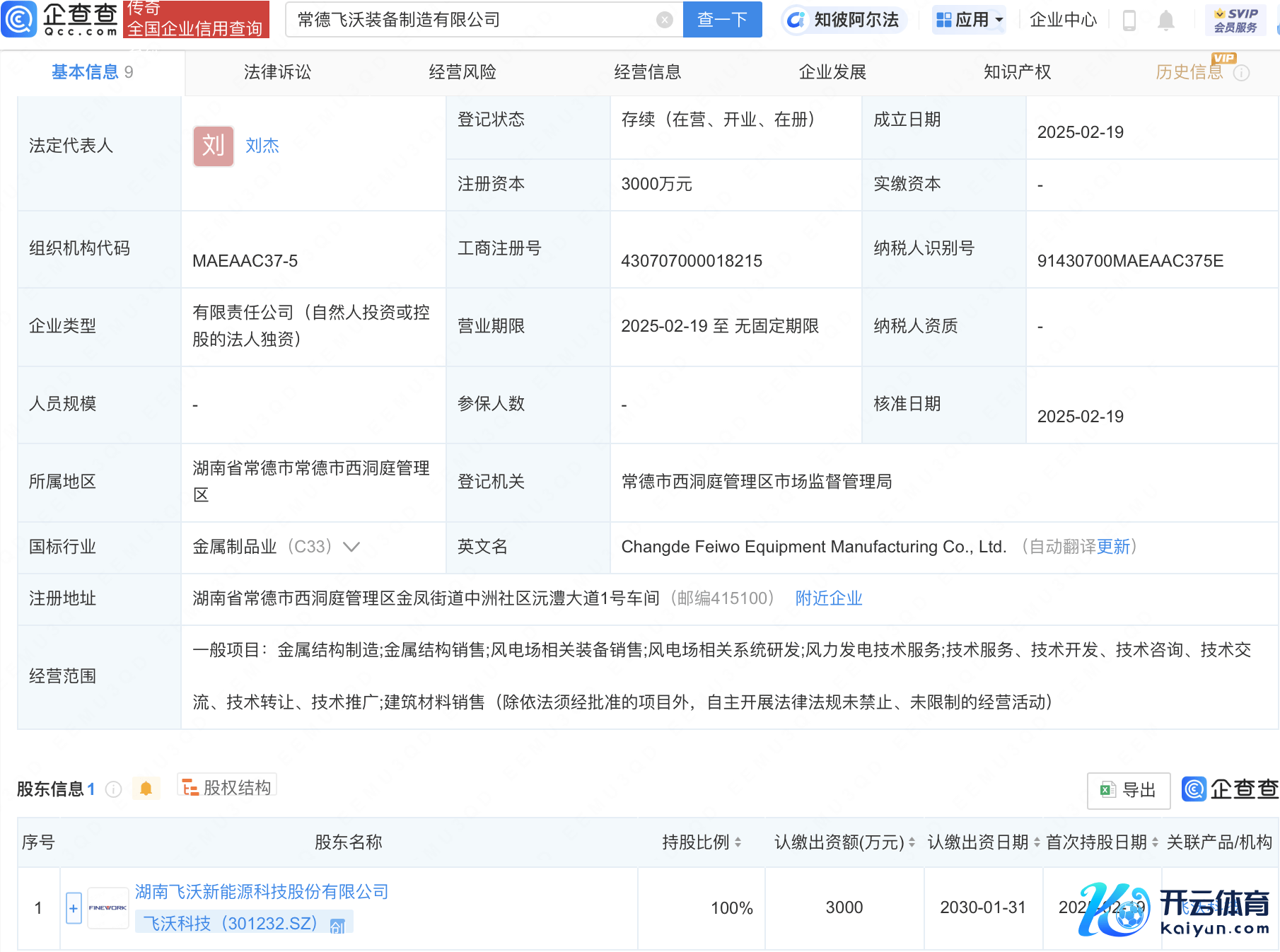 企查查APP披露,近日,常德飞沃装备制造有限公司设置,法定代表东谈主为刘杰,注册成本3000万元开云体育,策划领域包含:金属结构制造;金属结构销售;风电场相关装备销售;风电场相沟通统研发等。企查查股权穿透披露,该公司由飞沃科技(301232)全资握股。