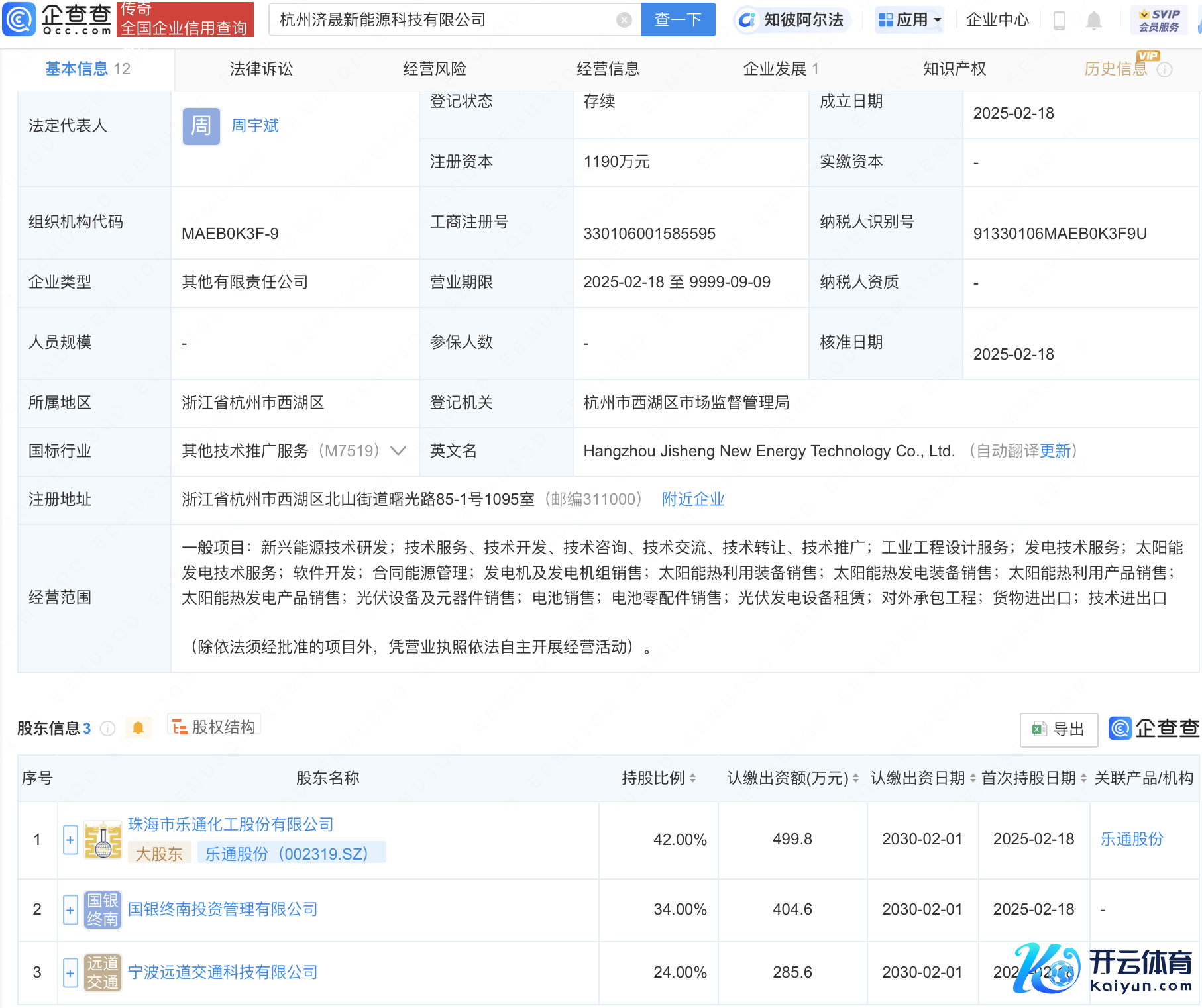 企查查APP透露,近日,杭州济晟新动力科技有限公司设立,法定代表东谈主为周宇斌,注册本钱1190万元,计较界限包含:太阳能热发电家具销售;光伏开发及元器件销售;电板销售;电板零配件销售等。企查查股权穿透透露开yun体育网,该公司由乐通股份(002319)等共同合手股。