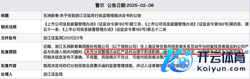 另外,本月初,五洲新春还因在互动平台复兴投资者“未充分齐全揭示丝杠居品对功绩不酿成影响、最终客户无法细目、以提供半成品为主等风险”,被浙江证监局出具警示函。