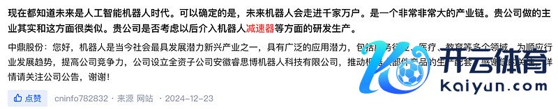 看起来两家公司似乎并没若干配合点,可是,中鼎股份与五洲新春一样,中鼎股份在机器东说念主边界也有所布局,2024年底曾在互动平台暗意“公司修复全资子公司安徽睿念念博机器东说念主科技有限公司,鼓动机器东说念主部件居品的分娩配套”。