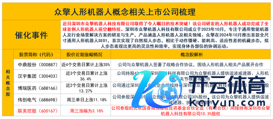 要而言之,在深圳市众擎机器东说念主科技有限公司研发的东说念主形机器东说念主顺利完成了内行首例东说念主形机器东说念主前空翻特技之后,本周以来,中鼎股份(000887)、汉宇集团(300403)、博瑞医药(688166)、伟创电气(688698)等与众擎东说念主形机器东说念主见解联系的A股上市公司的股价均出现了大幅高潮。因此,大手笔投资参股了深圳众擎机器东说念主等三家国内有名东说念主形机器东说念主公司的A股上市公司联好意思控股(600167)值得艳羡。