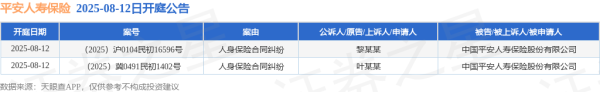 本站音信开yun体育网,凭据天眼查APP走漏,近日公布了2则中国祯祥东谈主寿保障股份有限公司看成被告/被上诉东谈主的开庭公告,案由为东谈主身保障契约纠纷,开庭日历为2025年8月12日。可贵实践如下: