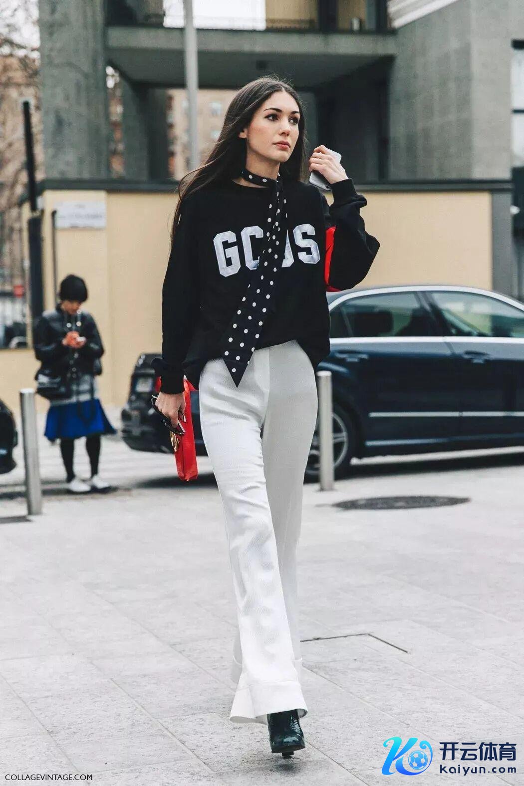 配上白色喇叭高腰裤,