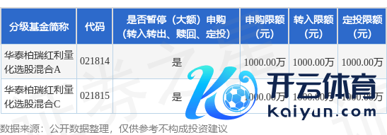 本站音问,9月24日华泰柏瑞基金惩处有限公司发布《华泰柏瑞红利量化选股夹杂型证券投资基金暂停大额申购(含治疗转入、按期定额投资)业务的公告》。公告中教唆,为保证本基金的结识运作开云体育,保护基金份额握有东说念主利益,自2025年9月24日起华泰柏瑞红利量化选股夹杂型证券投资基金暂停大额申购(含治疗转入、按期定额投资)业务,申购、治疗转入上限金额为1000.0万元,下属分级基金调整明细如下: