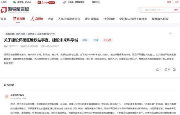 说到北京的怀柔,大众第一响应可能是山净水秀、空气好,但最近几年,这场合真实越来越吵杂了。改日科学城、影视城,还有一堆大学和盘考生院齐搬过来了。东谈主才多了,发展也快,可交通问题就成了不少东谈主心里的疙瘩。 前两天,有位网友在“带领留言板”上发声,说怀柔目下发展得这样好,多样魁岸上的神气齐落地,可通勤照旧靠公交为主,每天挤来挤去,上班族和学生们可太痛楚了。尤其是改日科学城何处,要留住东谈主才没个顺畅的交通线还真不行。这位网友径直淡薄:能不成给怀柔建个地铁站,让大众出行绵薄点,也让更多东谈主抖擞留